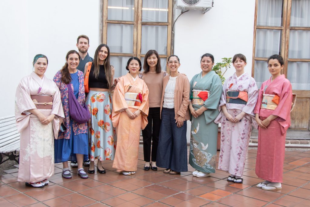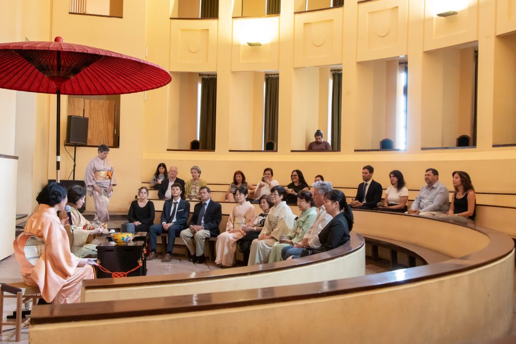 El pasado 14 de noviembre de 2025 el “Complejo Histórico Cultural Manzana de las Luces” se vistió de kimono en tonos primaverales: flores del cerezo, del ciruelo, glicinas. Las anfitrionas de la Escuela Urasenke Argentina dieron la bienvenida a los invitados. Con gestos medidos nos invitaron a descender las escaleras de un fresco anfiteatro con paredes del color de la flor del durazno tal cual kimono de Malena Higashi sensei. Anfitriones, invitados, un mueble de laca, los utensilios para el té, una sombrilla carmesí, un tokonoma con caligrafía, una hortensia en florero de caña de bambú y un incensario de flor de loto, armonizaban con el vacío. Un silencio plácido acompañó la ceremonia del té, donde todos fuimos agasajos. Un momento único compartido de humildad y modestia.