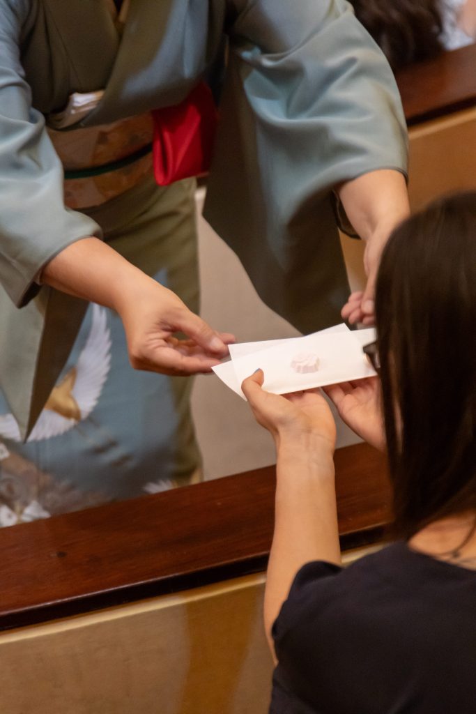 “El dulce que servimos se llama rakugan, es una masita de azúcar wasanbon prensada. Esta vez servimos con formas de flores y corriente de agua, para transmitir un poco de frescura en un día caluroso de noviembre. Lo prepararon con mucho esmero María Storniolo y Midori Graham. Ambas son alumnas de la escuela y Midori tiene un emprendimiento de wagashi y dulces tradicionales japoneses que se llama Azuki Atelier”.