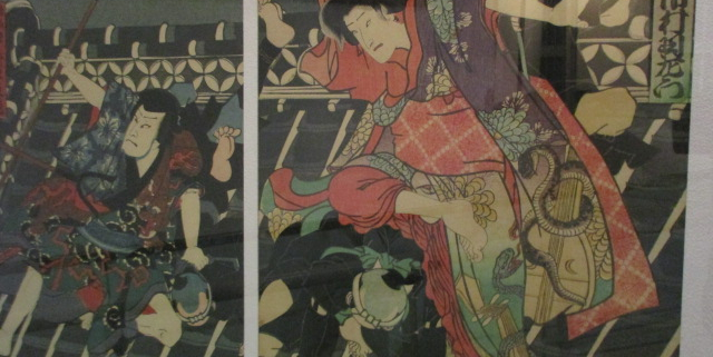 Escena de teatro kabuki. El actor Naramura Shibazo en el rol Nango Rikimaru luchando con rastrillo de guerra y el actor Ichimura Hazaemon en el rol de Benten Kozo Kikunosuke. Obra de Utagawa Kunisada, s. XIX, xilografía en papel.