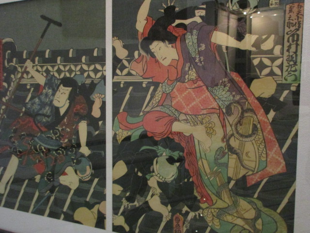 Escena de teatro kabuki. El actor Naramura Shibazo en el rol Nango Rikimaru luchando con rastrillo de guerra y el actor Ichimura Hazaemon en el rol de Benten Kozo Kikunosuke. Obra de Utagawa Kunisada, s. XIX, xilografía en papel.