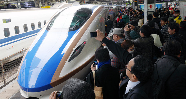 Tempranísimo, a las 6 de la mañana del sábado 14 de marzo, cientos de fanáticos de los trenes, autoridades del gobierno nacional y prefectural, y representantes de la Japan Railway East (JR East) y Japan Railway West (JR West) asistieron a la partida del primer servicio regular. La expectativa fue tal que los pasajes se vendieron en 25 segundos apenas se pusieron a la venta el pasado 14 de febrero.