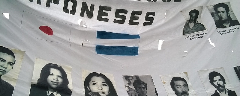 La bandera de los detenidos-desaparecidos nikkei no nos permitirá nunca olvidar a los que allí perdurarán por haber sido fieles a sus ideales: Juan Carlos Higa, Jorge Oshiro, Katsuya «Cacho» Higa, Juan Takara, Carlos Ishikawa, Amelia Ana Higa, Carlos Aníbal Nakandakare, Norma Inés Matsuyama, Luis Esteban Matsuyama, Oscar Ohshiro, Julio Eduardo Gushiken, Jorge Nakamura, Ricardo Dakuyaku, Carlos Horacio Gushiken, Juan Alberto Asato, Emilio Yoshimiya, Juan Alberto Cardoso Higa. Foto del FB de Akemi Gra Arakaki.