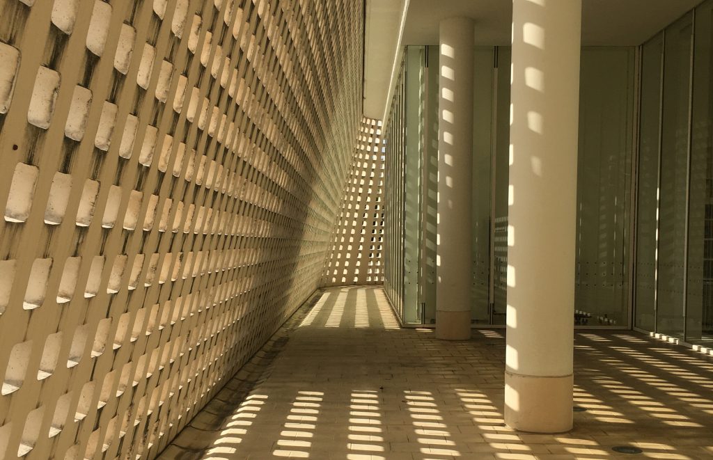 Pero había un problema: los bloques creaban muros ciegos que suprimían la entrada de luz y viento en el edificio. En 1954, el arquitecto Hisao Nakaza (1904-1962) advirtió esto e incorporó huecos en los bloques, obstruyendo parcialmente la vista a la vez que permitía la entrada de luz y ventilación. Los llamó Bloques Hana y creó muchos edificios con ellos.