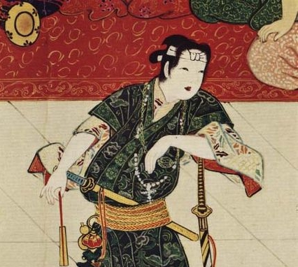 Izumo no Okuni vestida como «kabukimono» -un samurai rebelde y pendenciero- que la inspiró en la creación del kabuki.