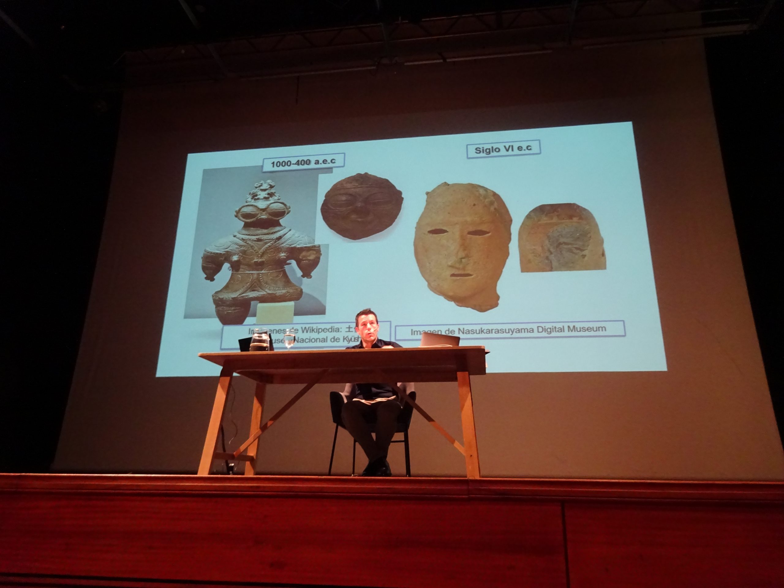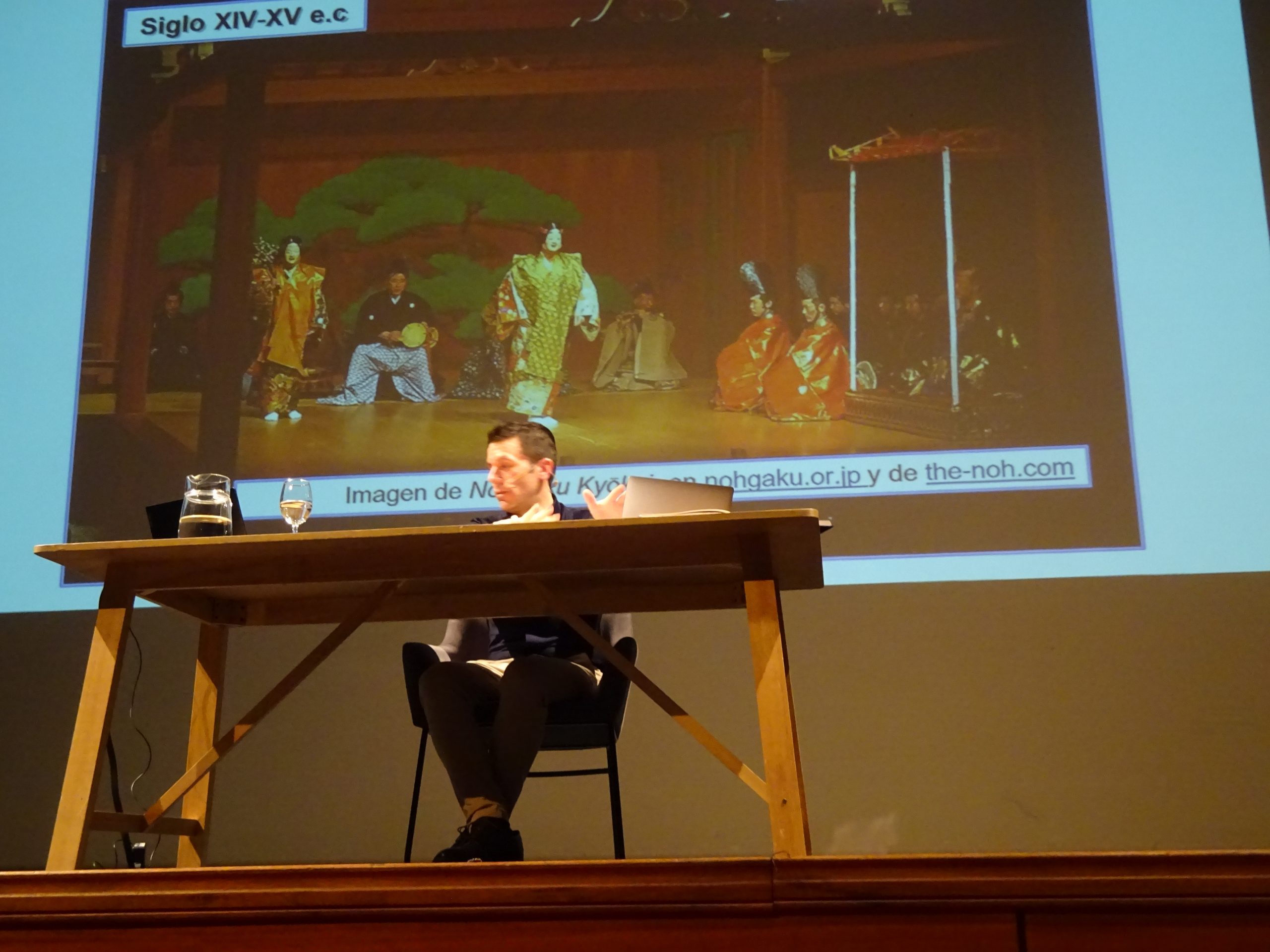 El Prof. Chiappe comenzó preguntándose ¿Por qué máscaras?: “Las máscaras han tenido una función muy variada no sólo en la cultura japonesa sino en diversas culturas del mundo. Son el elemento, por excelencia simbólico, que mezcla lo externo y lo interno, o que es la barrera entre lo interno y lo externo, entre lo esencial y lo aparente, entre lo público y lo privado también. Vamos a ver diversos ejemplos de novelas y personajes, los cuales, estas diferentes membranas que tiene como función la máscara, está en la acción de la literatura japonesa”.
