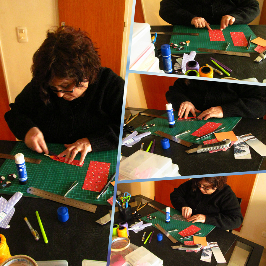 En mis diseños trato además de agregar elementos que aporten más realismo a la escena: abanicos, hagoitas, kakemonos, katanas, cometas, etc. He sumado también al papel otros materiales: cintas, telas, hilos, cuentas de colores, pequeñas flores para realzar las figuras y darles mi impronta.