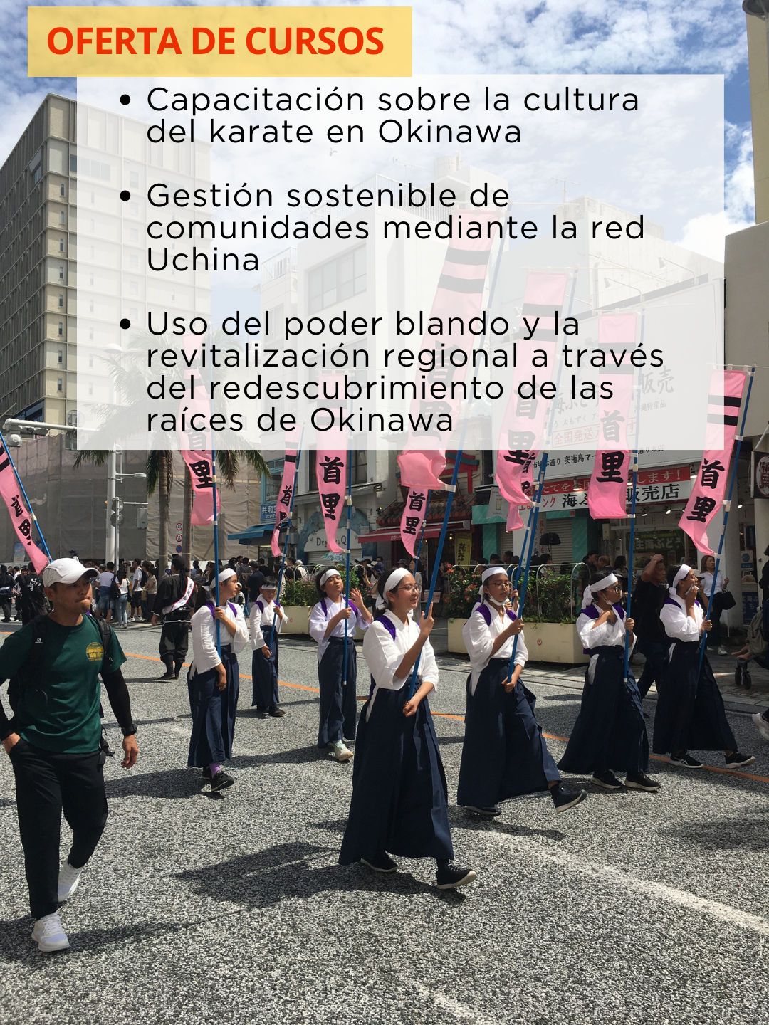 Requisitos: Participar en actividades culturales de Okinawa en la comunidad prefectural, tener entre 21 y 40 años de edad, y un nivel de idioma japonés equivalente a N4 o superior.