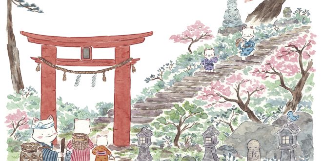 El gatito surgió en Okinawa. Durante mi estadía solía ir a dibujar a templos y parques de la ciudad de Naha, con acuarelas pinté esos escenarios que quería atesorar. El gatito fue el personaje que descubría esos nuevos lugares, me acompañó en todo el viaje y se convirtió en un personaje recurrente, además estaba relacionado con mi gatito de esa época, Quique, al que extrañaba.